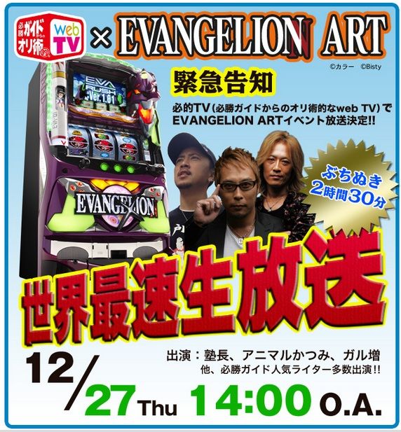 放送時間は12/27(木)14:00~16:30 (予定)。必的tv(http://t.co/b7EkrP8e)にて視聴可能となっています。無料の会員登録をすればご覧になれます。超新機種ヱヴァンゲリヲンART機がどこよりも早く見られます。お楽しみに!!!