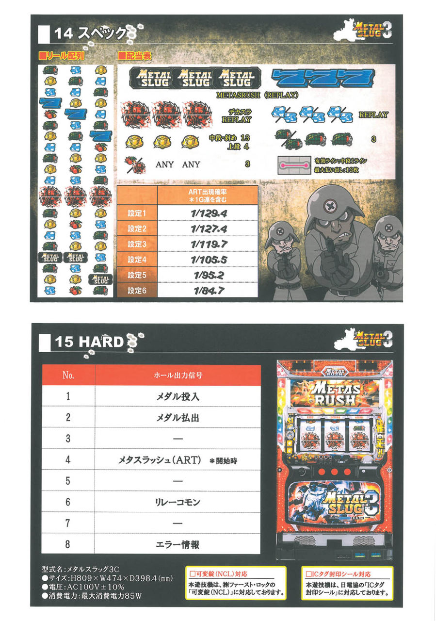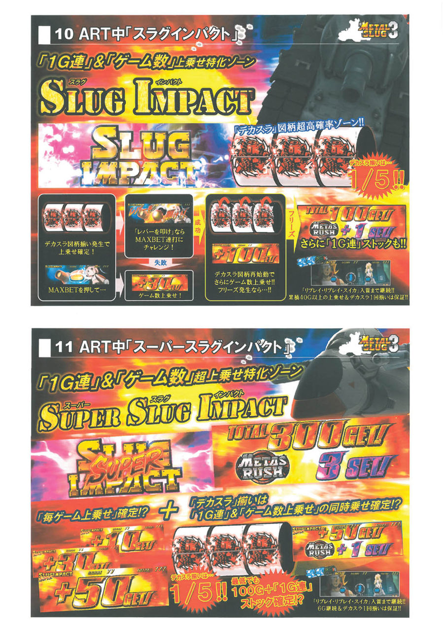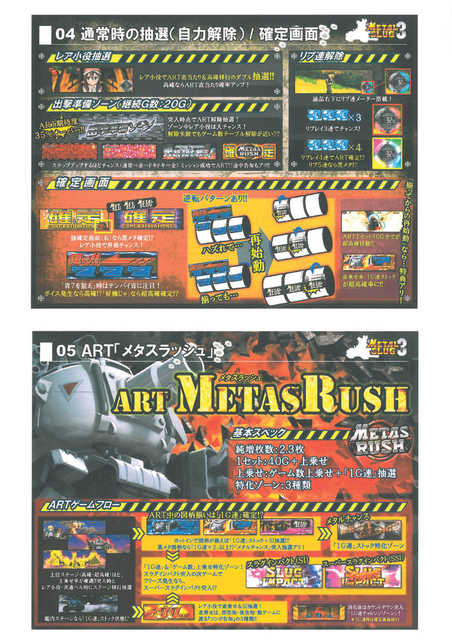 ■通常時の抽選通常A0G-128G129-192G193-320G テーブルチャンス321-384G385-512G テーブルチャンス513-576G577-704G テーブルチャンス705-768G769-896G テーブルチャンス897-960G961-999G テーブルチャンス※天井999G通常B0G-128G129-192G テーブルチャンス193-320G テーブルチャンス321-384G385-512G テーブルチャンス513-576G577-704G テーブルチャンス705-768G テーブルチャンス※天井768G天国0G-128G テーブルチャンス※天井128G■出撃準備ゾーン(CZ)20G継続のART突入チャンスゾーン。ART当選期待度は35%Over。■メタスラッシュ(ART)1Set40Gの押し順ART。1Gあたりの純増枚数は約2.3枚。G数上乗せ+1G連+3つ上乗せ特化ゾーンを搭載。ART中の図柄揃いは1G連ストック&特化ゾーン抽選が行われる。■メタルチャンス(1G連特化ゾーン)0G連で3回図柄が揃う1G連ストック特化ゾーン。3回黒メタ揃いでMAX1G連?6回のストック。■スラグインパクト(1G連&G数上乗せ特化ゾーン)1G連&G数上乗せ特化ゾーン。この間はデカスラ図柄が1/5で揃い超高確率状態。■スーパースラグインパクト(1G連&G数超上乗せ特化ゾーン)1G連&G数超上乗せ特化ゾーン。この間は毎G上乗せ+デカスラ揃いは1G連&G数上乗せの同時乗せ確定。■機械割設定1 96.7%設定2 98.3%設定3 99.9%設定4 104.2%設定5 108.5%設定6 113.1%■ボーナス確率<黒メタ揃い確率>設定1 1/1532.5設定2 1/1514.6設定3 1/1405.9設定4 1/1231.9設定5 1/1072.9設定6 1/905.9<青7揃い確率>設定1 1/141.3設定2 1/139.1設定3 1/130.9設定4 1/115.4設定5 1/104.4設定6 1/93.5<ART突入率>※1G連含む設定1 1/129.4設定2 1/127.4設定3 1/119.7設定4 1/105.5設定5 1/95.2設定6 1/84.7
