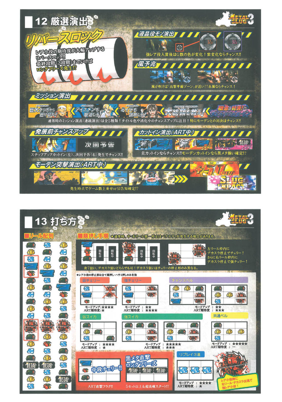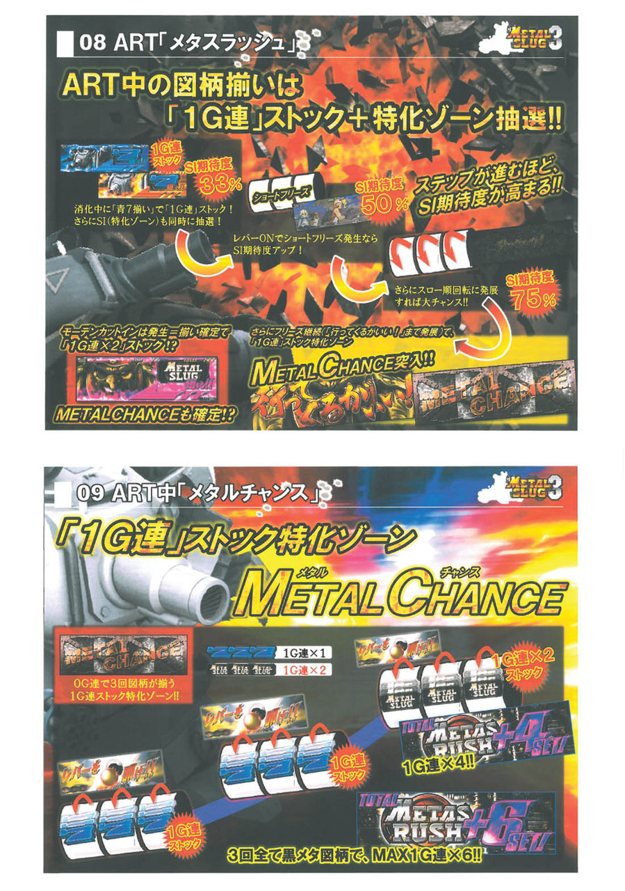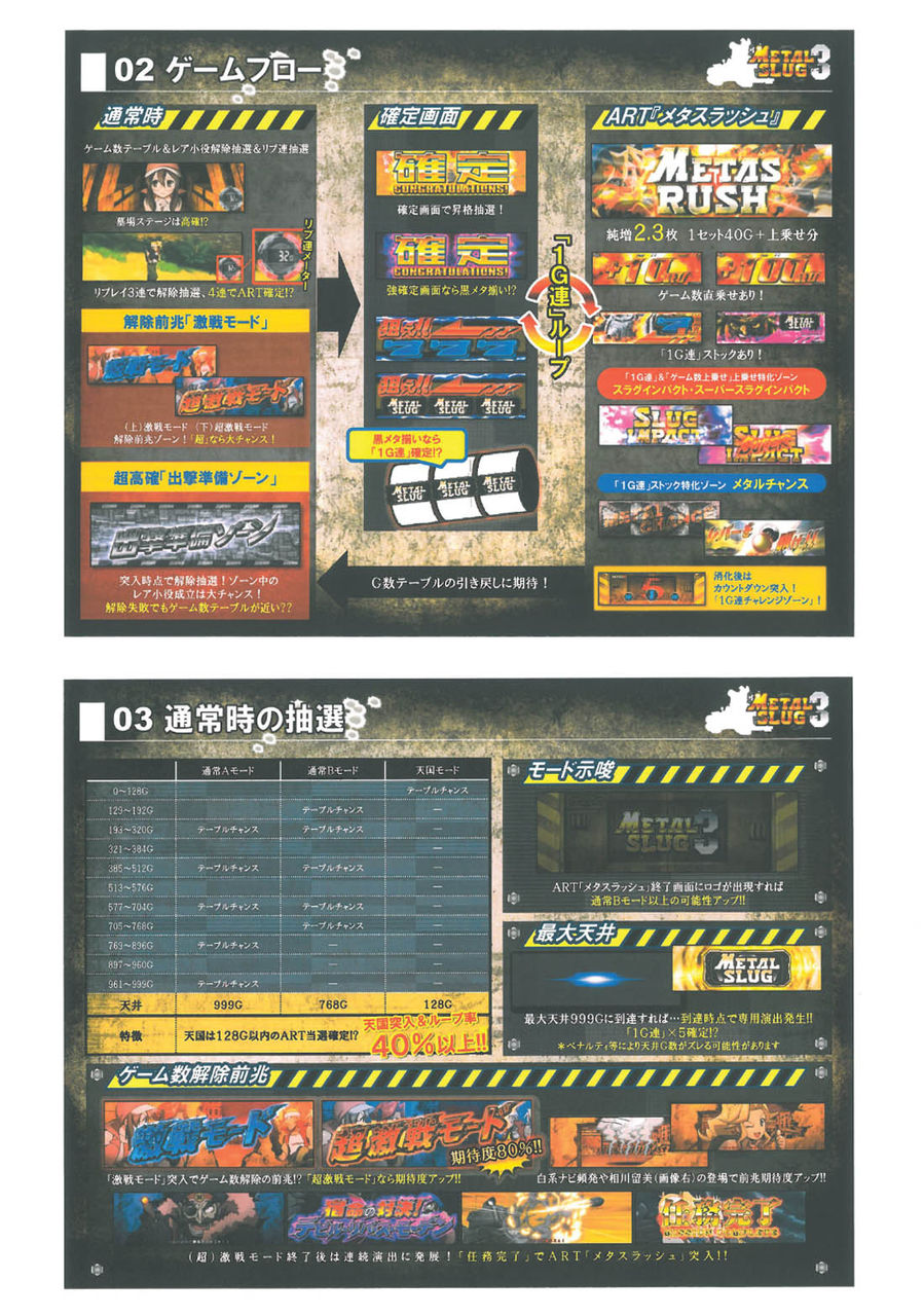 ■通常時の抽選通常A0G-128G129-192G193-320G テーブルチャンス321-384G385-512G テーブルチャンス513-576G577-704G テーブルチャンス705-768G769-896G テーブルチャンス897-960G961-999G テーブルチャンス※天井999G通常B0G-128G129-192G テーブルチャンス193-320G テーブルチャンス321-384G385-512G テーブルチャンス513-576G577-704G テーブルチャンス705-768G テーブルチャンス※天井768G天国0G-128G テーブルチャンス※天井128G■出撃準備ゾーン(CZ)20G継続のART突入チャンスゾーン。ART当選期待度は35%Over。■メタスラッシュ(ART)1Set40Gの押し順ART。1Gあたりの純増枚数は約2.3枚。G数上乗せ+1G連+3つ上乗せ特化ゾーンを搭載。ART中の図柄揃いは1G連ストック&特化ゾーン抽選が行われる。■メタルチャンス(1G連特化ゾーン)0G連で3回図柄が揃う1G連ストック特化ゾーン。3回黒メタ揃いでMAX1G連?6回のストック。■スラグインパクト(1G連&G数上乗せ特化ゾーン)1G連&G数上乗せ特化ゾーン。この間はデカスラ図柄が1/5で揃い超高確率状態。■スーパースラグインパクト(1G連&G数超上乗せ特化ゾーン)1G連&G数超上乗せ特化ゾーン。この間は毎G上乗せ+デカスラ揃いは1G連&G数上乗せの同時乗せ確定。■機械割設定1 96.7%設定2 98.3%設定3 99.9%設定4 104.2%設定5 108.5%設定6 113.1%■ボーナス確率<黒メタ揃い確率>設定1 1/1532.5設定2 1/1514.6設定3 1/1405.9設定4 1/1231.9設定5 1/1072.9設定6 1/905.9<青7揃い確率>設定1 1/141.3設定2 1/139.1設定3 1/130.9設定4 1/115.4設定5 1/104.4設定6 1/93.5<ART突入率>※1G連含む設定1 1/129.4設定2 1/127.4設定3 1/119.7設定4 1/105.5設定5 1/95.2設定6 1/84.7