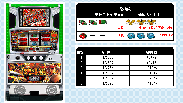コナミが誇る人気アクションシューティングゲーム「魂斗羅」が待望のパチスロ化を果たした。本機は純増約2.8枚のハイスペックAT「魂斗羅タイム」(1セット40ゲーム+α)を搭載しており、ゲーム数上乗せに特化した仕様となっている。魂斗羅タイムにセット数のストックや継続率といった概念はなく、初当たり時に1~7セットが選択される仕組みだ。AT突入契機は、ゲーム数解除・自力解除・レア小役による直撃当選の3種類。ゲーム数解除ゾーンは、「嵐ゾーン」→「炎ゾーン」→「魂ゾーン」とステージが進むほど期待度がアップし、自力解除高確ゾーンでは「殲滅チャンス」(期待度33%オーバー)中に1ゲーム限定の「大殲滅チャンス」(期待度50%オーバー)が発生すれば激アツとなる。レア小役による直撃抽選はベルの連続でも有効で、4連続ならAT確定だ。なお、本機には「バトルチャージRUSH」&「魂斗羅エクスプロージョン」といった上乗せ特化ゾーンも存在。いずれもレベルアップするほど1回あたりの上乗せゲーム数が増えていく仕組みで、突入時に「超」という文字が付くパターンなら上乗せゲーム数が50or100ゲームとなるレベルMAXからのスタートが確定するぞ。