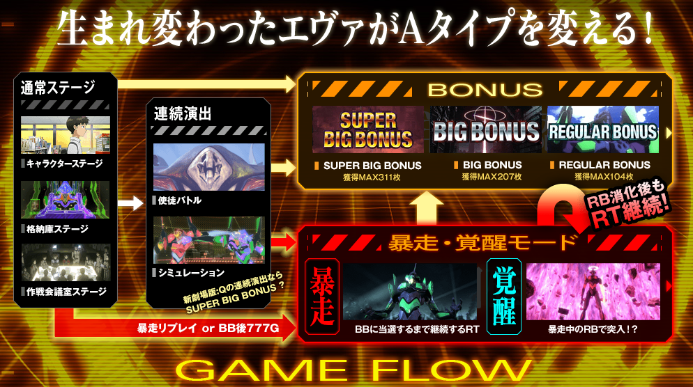 - エヴァスロ新作、パチスロ「ヱヴァンゲリヲン決意の刻」の一部仕様が発覚!噂通りのノーマルタイプ!RBでは終わらない天井RT(BIG間777G)「新暴走モード」を搭載!