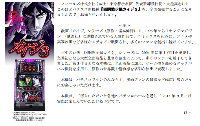 フィールズ株式会社(本社:東京都渋谷区、代表取締役社長:大屋高志)は、このほどパチスロ新機種『回胴黙示録カイジ3』を、全国発売することになりましたので、お知らせいたします。