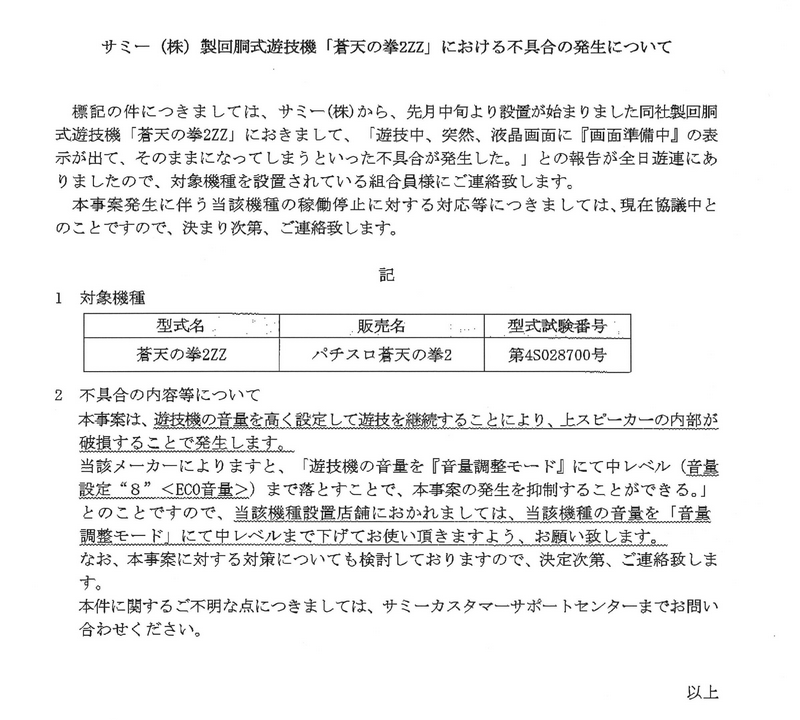 不具合の内容蒼天の拳2ZZにいて、遊技中、突然、液晶画面に「画面準備中」の表示が出て、そのままになってしまう。不具合の原因遊技機の音量を高くして遊技を継続する事により、上スピーカーの内部が破損する事で発生します。対策遊技機の音量を音量調整モードにて中レベル(音量設定"8")まで落とす事で発生の抑制が出来る。今後の対応当該機種の稼働停止に対する対応等につきましては、現在協議中との事。※出玉等には関係なさそうだから、個人的には稼働停止にはならないと思います。