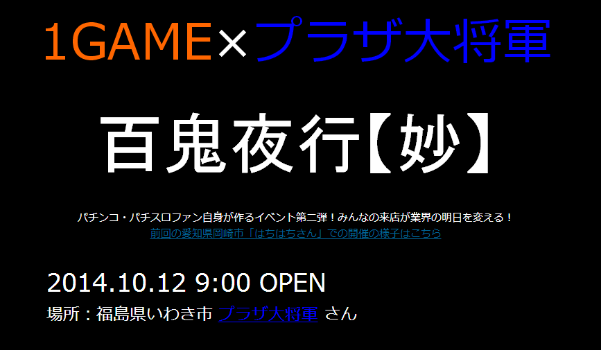 百鬼夜行【妙】パチンコ・パチスロファン自身が作るイベント第二弾!みんなの来店が業界の明日を変える!2014.10.12 9:00 OPEN場所:福島県いわき市 プラザ大将軍 さん