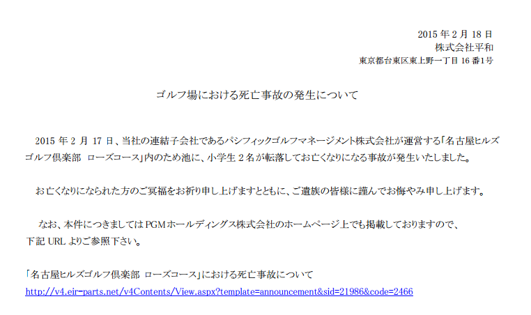 全国ニュースなどでも放映されご存じの方も多いと思いますが、平和の子会社が経営しているゴルフ場での事故だったようです。