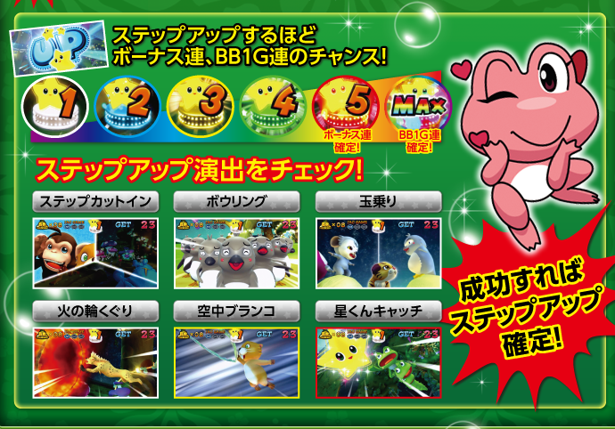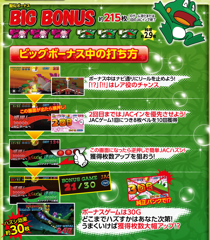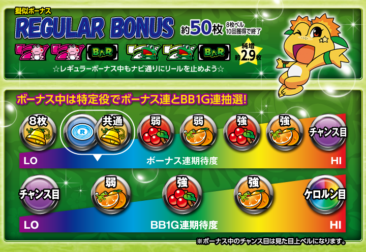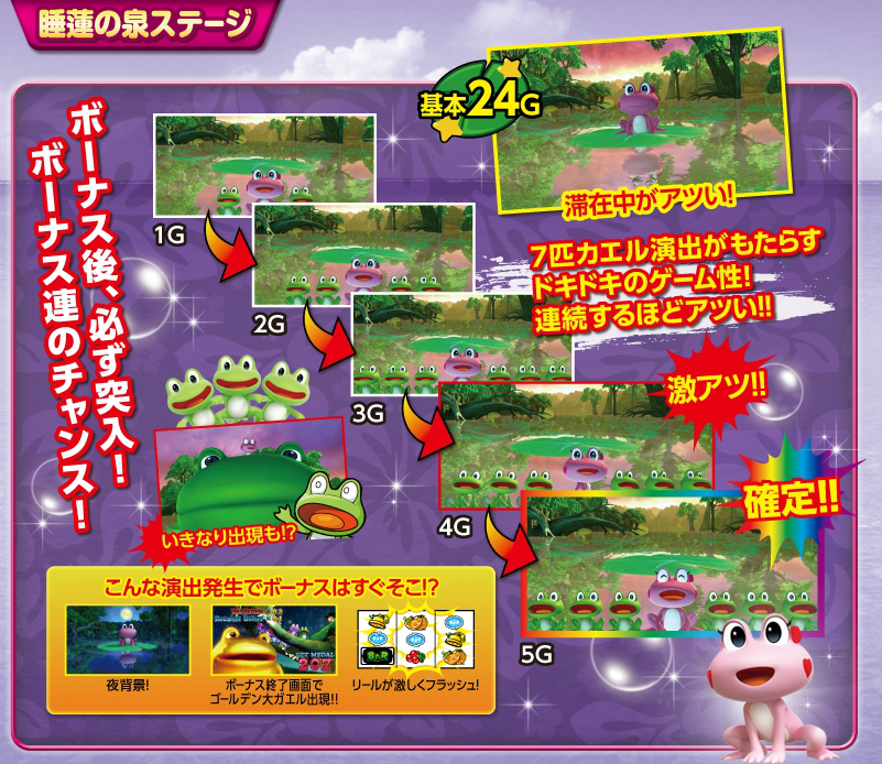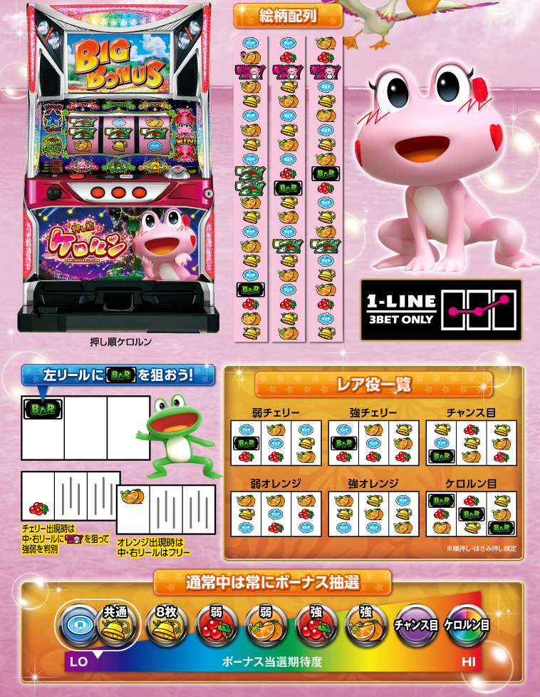 - 山佐、パチスロ「ケロルン」の一部スペック情報が判明!旧基準AT機で疑似ボーナスの連荘で出玉を増やすタイプ!導入は6月より!