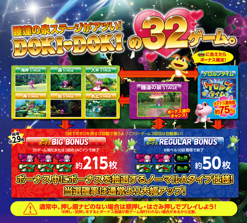 - 山佐、パチスロ「押し順ケロルン」の予告画像が公開!「Doki-Dokiの32G」がウリの擬似ボーナス機!噂通りの沖ドキタイプか!?