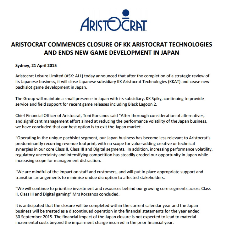 ㈱アリストクラートテクノロジーズ(菅沼正典代表取締役)のパチスロ市場撤退が決定。4月21日、同社の親会社であるアリストクラートレジャーがホームページ上で公表した。詳細は後日、明らかとなる見込み。