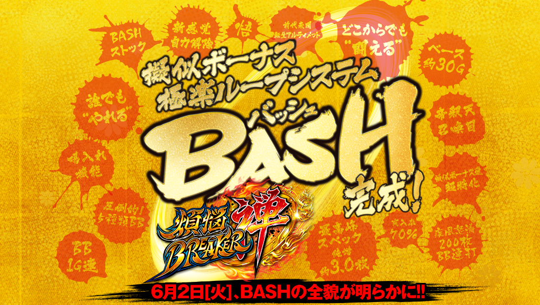 擬似ボーナス極楽ループシステムBASH完成!BASHストック新感覚自力解除前代未聞転生アルティメットどこからでも“闘える”誰でも“やれる”渇入れ機能圧倒的!5種類BB擬似ボーナス超特化BB1G連最高峰スペック純増約3.0枚突入率70%ベース約30G疾風怒涛200枚BB連打帝釈天召喚目悟