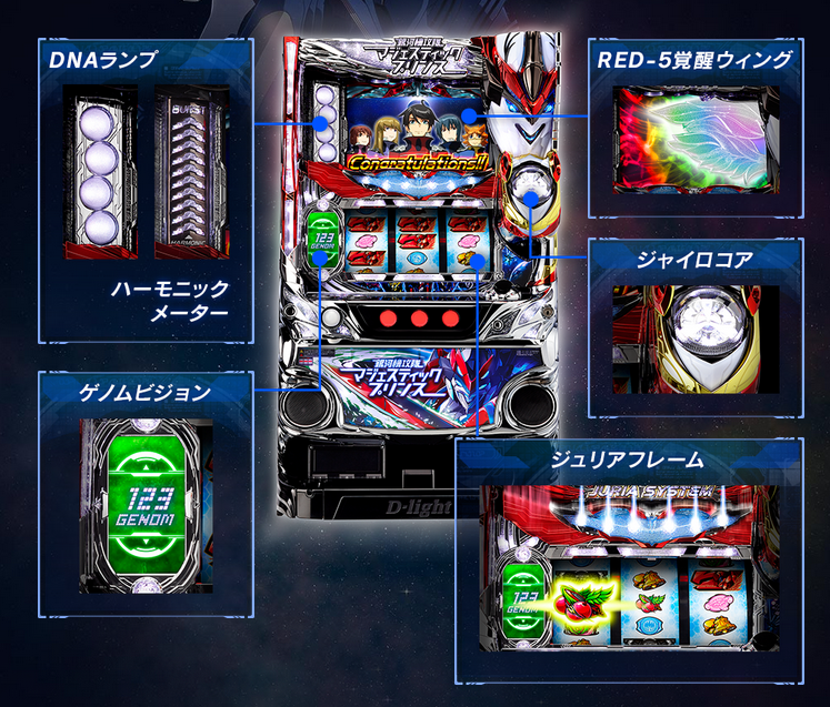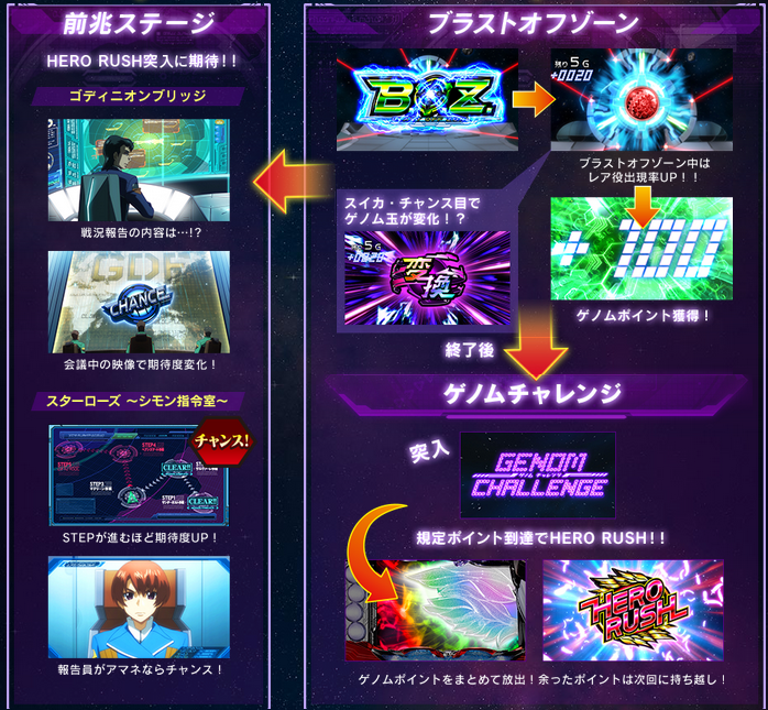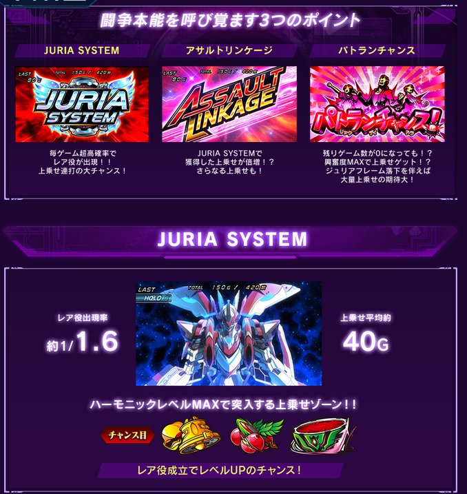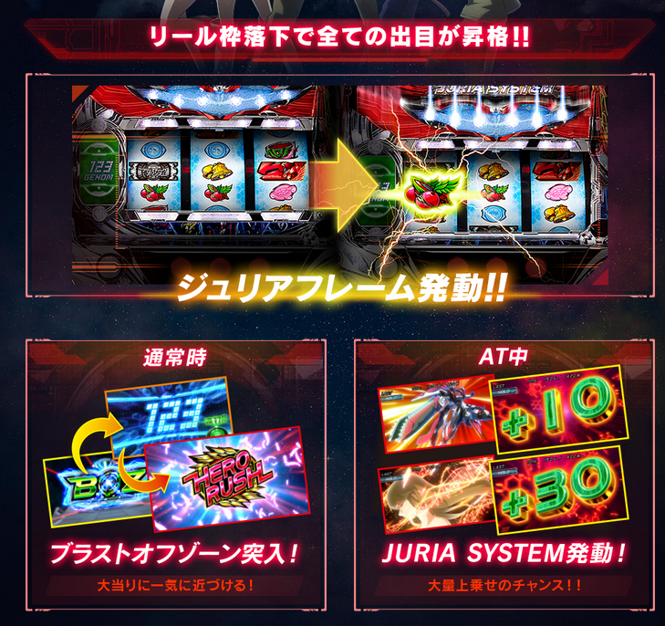 ゲーム性「ジュリアシステム」リール枠が移動し成立ラインが下がりラインが変わる事で、外れ目がチェリーに昇格等となる「ゲノムシステム」通常時は「ゲノムポイント」を積み上げ、規定ポイントでAT確定。1G=1ゲノムポイント(チェリーでポイント大量獲得のチャンス)「プラストゾーン」通常時に突入するポイント獲得ゾーン7or14or21G継続で毎Gレア役が成立(上乗せ抽選)AT「HERO RUSH」初期ゲーム数赤7シングル揃い40G・100G・200G・300G赤7ダブル揃い100G・200G・300G「AT中」は5人のキャラから選択(上乗せ演出が異なる)イズル:バランスタイプアサギ:目押しタイプ、レア役成立後バー揃いで上乗せスルガ:上乗せ時は30G以上タマキ:上乗せ時に玉を獲得し最終Gor4個獲得で解放ケイ:上乗せか否かを2G以内に完全告知「ジュリアシステム(AT中の特化ゾーン)」平均上乗せ:約40G「アサルトリンケージ(AT中の特化ゾーン)」平均上乗せ:約190G「フリーズ」AT3セット以上+初回AT100G以上「天井」1500ゲノムでAT当選(前兆経由で発動)平均880GAT 純増:約2.8枚約47G/50枚初当り確率1/4671/4501/4181/3651/3251/284出玉率97.2%98.1%100.1%104.1%107.2%113.0%