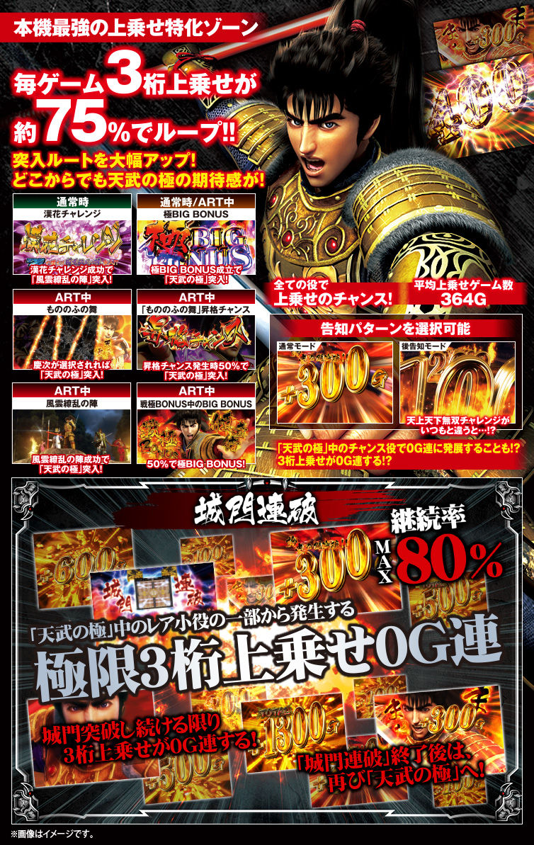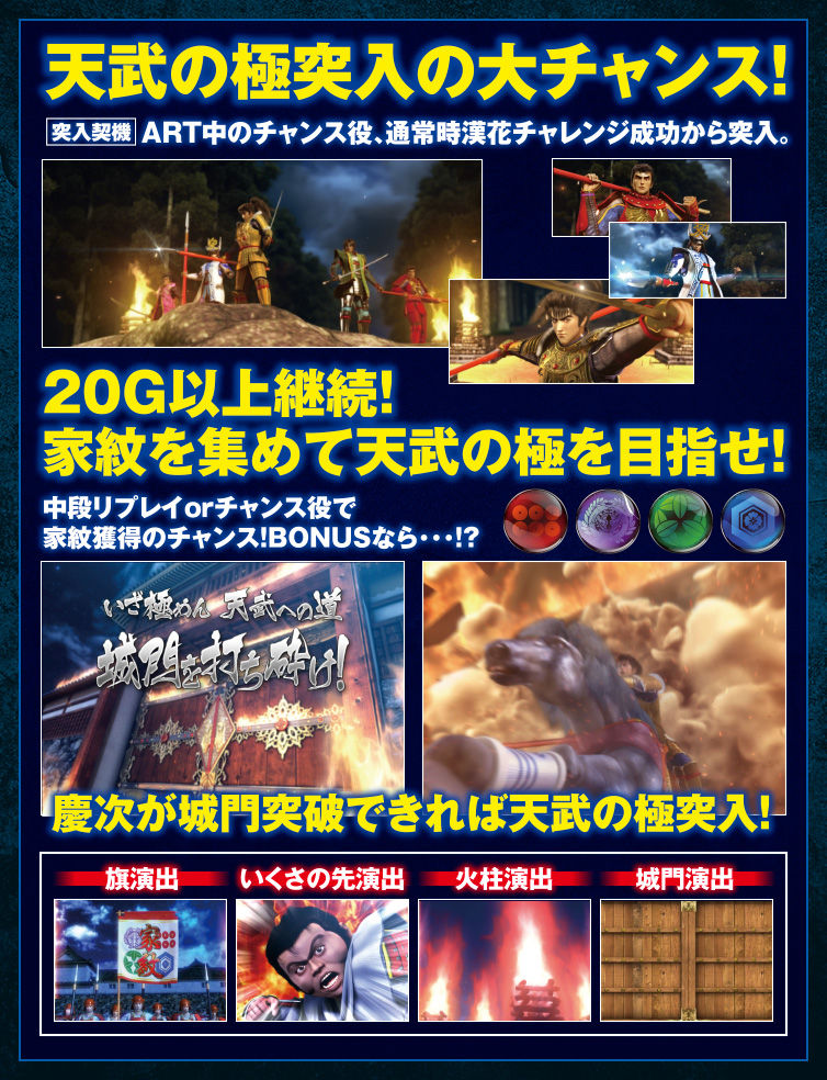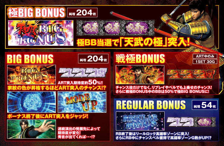 ART中のみ存在する疑似ボーナス中に純BIGを引くと50%で極ボーナス(天武の極確定)になるというのが熱いポイントで、個人的には好きですね。(まあ50%引けなかった時のショックもすごそうですが・・・)