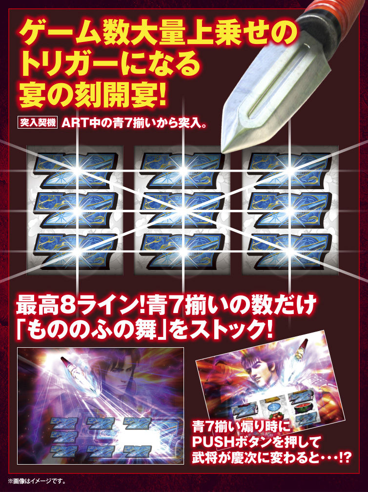 【基本情報】A+ARTG数上乗せ×継続ループ×特化ゾーンストックART継続率:約50%~約80%ART純増:1.6枚/GART初期G数:もののふの舞で決定千円G数:31.8Gコイン単価:下記に記載天井:ボーナス間999G⇒ART突入