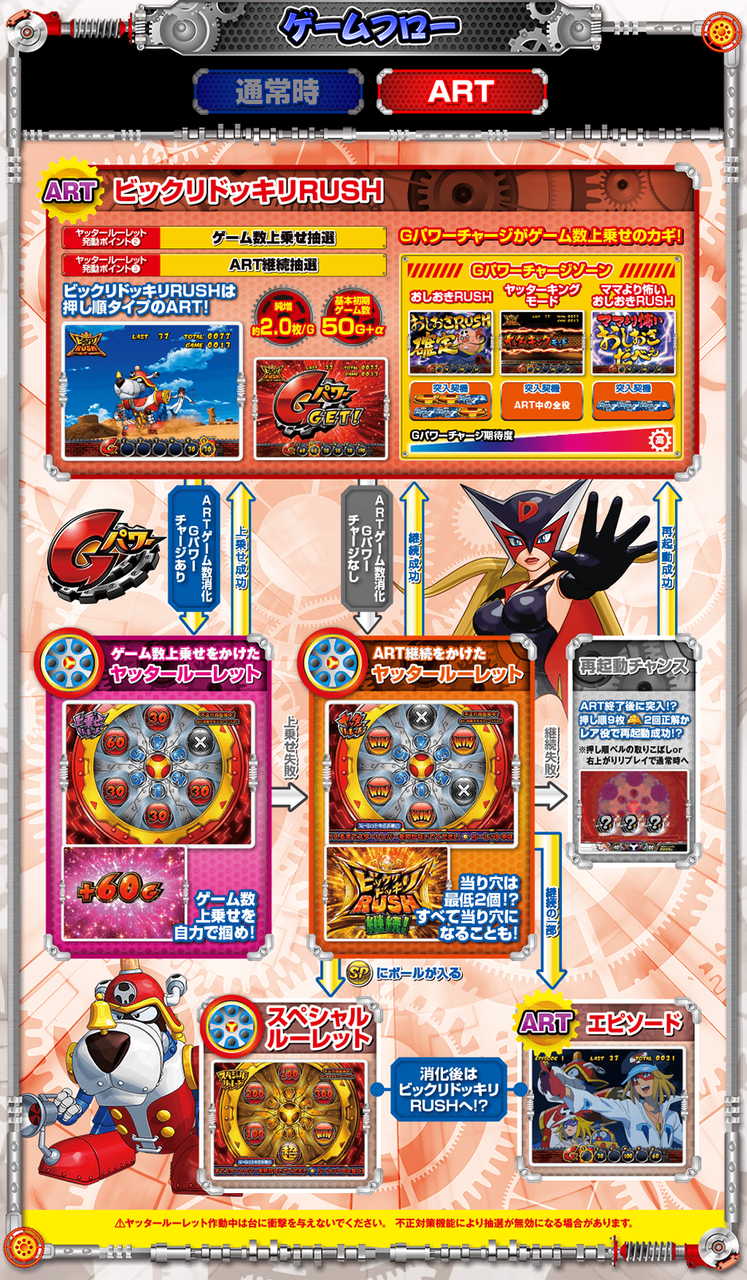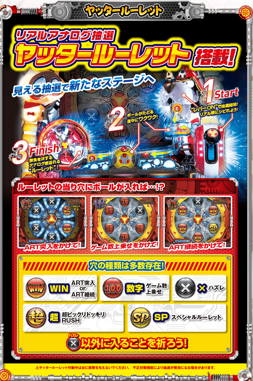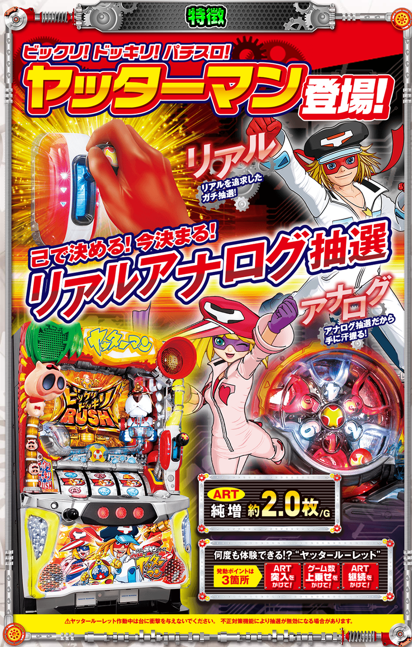 ■ヤッターマン (三洋)納期:11月中予定目標販売台数:25,000台疑似B/ART初当り/出率設定1 1/159.84/1/482.9/97.0%設定2 1/153.84/1/452.9/98.0%設定3 1/148.27/1/426.9/100.0%設定4 1/143.09/1/387.5/103.0%設定5 1/138.26/1/340.8/107.0%設定6 1/133.75/1/298.4/112.0%・設定1数値コイン単価:約2.2円MY:約1,900M◇:約2,400MY単価:約863.6千円ベース 約43G高ベースの新基準ARTメイン機(純増約2.0枚)。約6万分の1のリアルボーナス(204枚獲得)も搭載。消化中赤7揃い高確(G数上乗せ)+ART250Gスタート+継続率85%が確定。平均獲得期待枚数は2,500枚。通常モードは5つ。レア役でモードUP抽選とART直撃と疑似ボーナスを抽選。全役でモードUPする特殊ゾーンも搭載。疑似Bはベル6回成立で終了。平均獲得33枚。抽選で6個のルーレットマスをWINか×で埋めていく。引き次第では6個ともWINになることもある=ART突入確定。疑似B(設定1で約1/159)を通常中の上位モード時に引けるかがポイント。疑似B終了後は、筐体右部のレバー役物を下げることにより玉が発射。ルーレット役物1~6番のどこに入るかはガチ抽選。WINのところに入ればART突入。ART当選期待度は約30%(設定1)。ARTの初期G数は50G。継続率は約33~100%。消化中はレア役で1~6番のマスそれぞれにゲーム数をチャージ(上乗せ)していく。G数チャージ特化ゾーンも搭載(平均チャージG数約100G・135G・300Gの3種)。チャージG数があれば、ART消化後ルーレット演出で、1~6番の玉が入ったマスにチャージされているG数を上乗せする。ゲーム数の直乗せは無し。ルーレット演出による後乗せに集約。チャージG数がない場合は、ART消化後ルーレット演出で、WINのマスに玉が入ればART継続。WINは最低でも2/6マス(継続率約33%)。これに失敗しても再チャンスとして押し順ベル2回入賞か、レア役でARTを引き戻すことがある(約10%)。ルーレット演出時、稀にスペシャルルーレットになることがあり、WINではなく超というマスに玉を入れることができれば、継続抽選時常に5/6個以上のWINが確定する平均継続率85%のARTへ。天井は700Gか疑似B10回目でART確定。ルーレット役物搭載の専用筐体で、ARTの突入、継続、上乗せをリアルアナログ抽選で見せて、ユーザーに高揚感を与え楽しませるゲーム性となっている。6マスそれぞれにG数をチャージするゲーム性でG数が確定するものではないので、大きい数字を見せられるようになる(1回のチャージG数は最低30G~最大300G)。