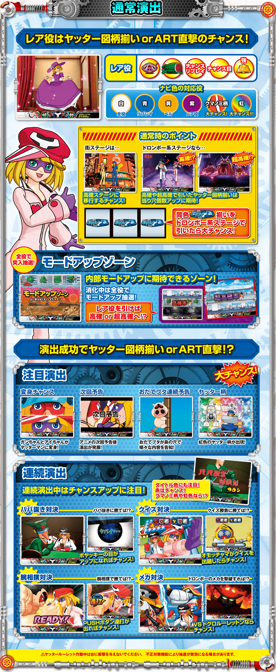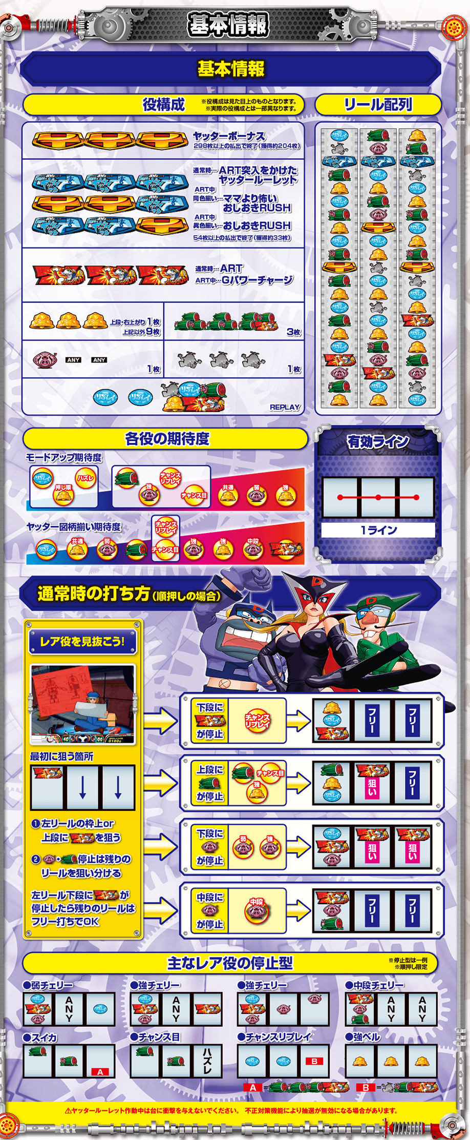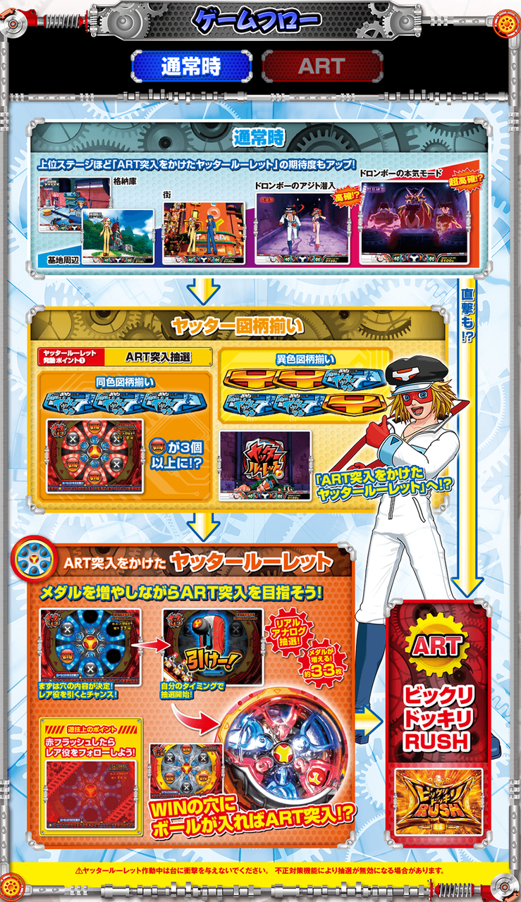 ■ヤッターマン (三洋)納期:11月中予定目標販売台数:25,000台疑似B/ART初当り/出率設定1 1/159.84/1/482.9/97.0%設定2 1/153.84/1/452.9/98.0%設定3 1/148.27/1/426.9/100.0%設定4 1/143.09/1/387.5/103.0%設定5 1/138.26/1/340.8/107.0%設定6 1/133.75/1/298.4/112.0%・設定1数値コイン単価:約2.2円MY:約1,900M◇:約2,400MY単価:約863.6千円ベース 約43G高ベースの新基準ARTメイン機(純増約2.0枚)。約6万分の1のリアルボーナス(204枚獲得)も搭載。消化中赤7揃い高確(G数上乗せ)+ART250Gスタート+継続率85%が確定。平均獲得期待枚数は2,500枚。通常モードは5つ。レア役でモードUP抽選とART直撃と疑似ボーナスを抽選。全役でモードUPする特殊ゾーンも搭載。疑似Bはベル6回成立で終了。平均獲得33枚。抽選で6個のルーレットマスをWINか×で埋めていく。引き次第では6個ともWINになることもある=ART突入確定。疑似B(設定1で約1/159)を通常中の上位モード時に引けるかがポイント。疑似B終了後は、筐体右部のレバー役物を下げることにより玉が発射。ルーレット役物1~6番のどこに入るかはガチ抽選。WINのところに入ればART突入。ART当選期待度は約30%(設定1)。ARTの初期G数は50G。継続率は約33~100%。消化中はレア役で1~6番のマスそれぞれにゲーム数をチャージ(上乗せ)していく。G数チャージ特化ゾーンも搭載(平均チャージG数約100G・135G・300Gの3種)。チャージG数があれば、ART消化後ルーレット演出で、1~6番の玉が入ったマスにチャージされているG数を上乗せする。ゲーム数の直乗せは無し。ルーレット演出による後乗せに集約。チャージG数がない場合は、ART消化後ルーレット演出で、WINのマスに玉が入ればART継続。WINは最低でも2/6マス(継続率約33%)。これに失敗しても再チャンスとして押し順ベル2回入賞か、レア役でARTを引き戻すことがある(約10%)。ルーレット演出時、稀にスペシャルルーレットになることがあり、WINではなく超というマスに玉を入れることができれば、継続抽選時常に5/6個以上のWINが確定する平均継続率85%のARTへ。天井は700Gか疑似B10回目でART確定。ルーレット役物搭載の専用筐体で、ARTの突入、継続、上乗せをリアルアナログ抽選で見せて、ユーザーに高揚感を与え楽しませるゲーム性となっている。6マスそれぞれにG数をチャージするゲーム性でG数が確定するものではないので、大きい数字を見せられるようになる(1回のチャージG数は最低30G~最大300G)。