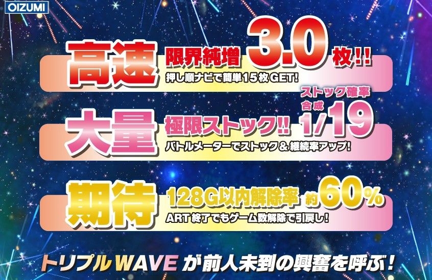 ■バトルモード(ART)1Set30Gの押し順ART。1Gあたりの純増枚数は約3.0枚。ストック&ループ仕様で、ART中のストック確率は約1/19。当選役に応じて液晶下部のメーターが貯まり、MAXになれば1個以上のストックが確定。バトルモード終了後は撃モードに移行。●ストック期待度どかーん図柄(ストック&ハイモード確定)>7揃い(ストック確定)>中段チェリー>チャンス目>スイカ>ハズレ>ベル>リプレイ●ART中のモードモードD>モードC>モードB>モードA※上位モードほどメーターアップの期待度が高い。■撃モード(AT)平均7.3G滞在のAT。1Gあたりの純増枚数は約1.0枚。■天井通常時1280G消化でART確定。■機械割設定1 97.3%設定2 98.2%設定3 100.1%設定4 103.6%設定5 107.0%設定6 111.2%■ボーナス確率<ART突入率>設定1 1/265.7設定2 1/243.6設定3 1/247.7設定4 1/215.3設定5 1/206.7設定6 1/168.4